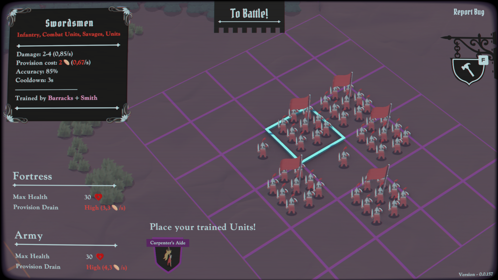 You start with an empty piece of land, where you can construct your first castle buildings. Place training grounds and use synergies with other buildings to train your army.